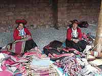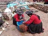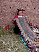 | Chinchero, the "birthplace of the rainbow" as it was known by the Incas is a highland community (approx. 12,500 feet elevation) about 30 miles outside of Cuzco. It has a very active community of weavers who have revived traditional and ancient techniques, abandoning modern equipment and yarns. Their mantas (shawls)are woven on backstrap looms, using hand-spun wools dyed by hand with traditional natural dyes. This is a much more difficult and time consuming way to produce their fine crafts, but the women are sincerely devoted to keeping the ancient skills alive. Some of the artists' groups also conduct classes and workshops for other weavers, including foreign visitors, the most important one being The Center for Traditional Textiles of Cusco where most of the following photos were taken. |